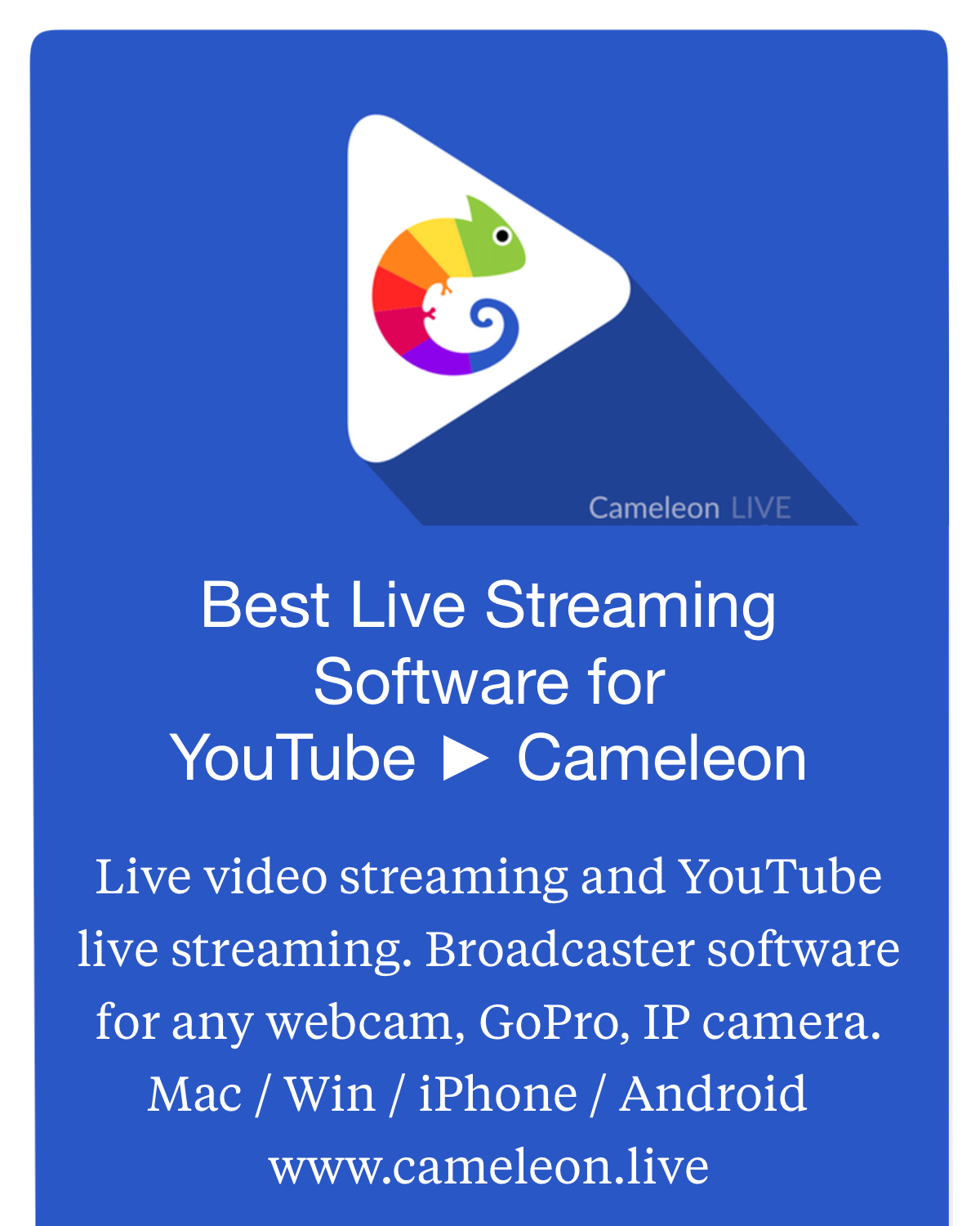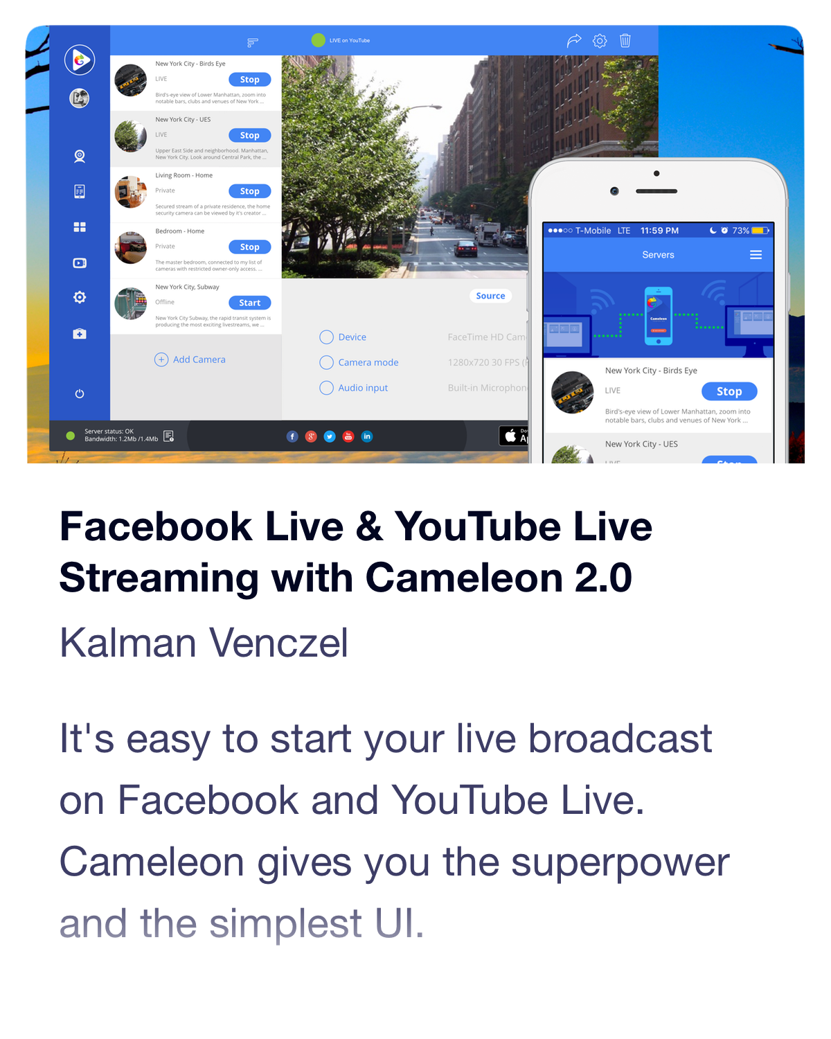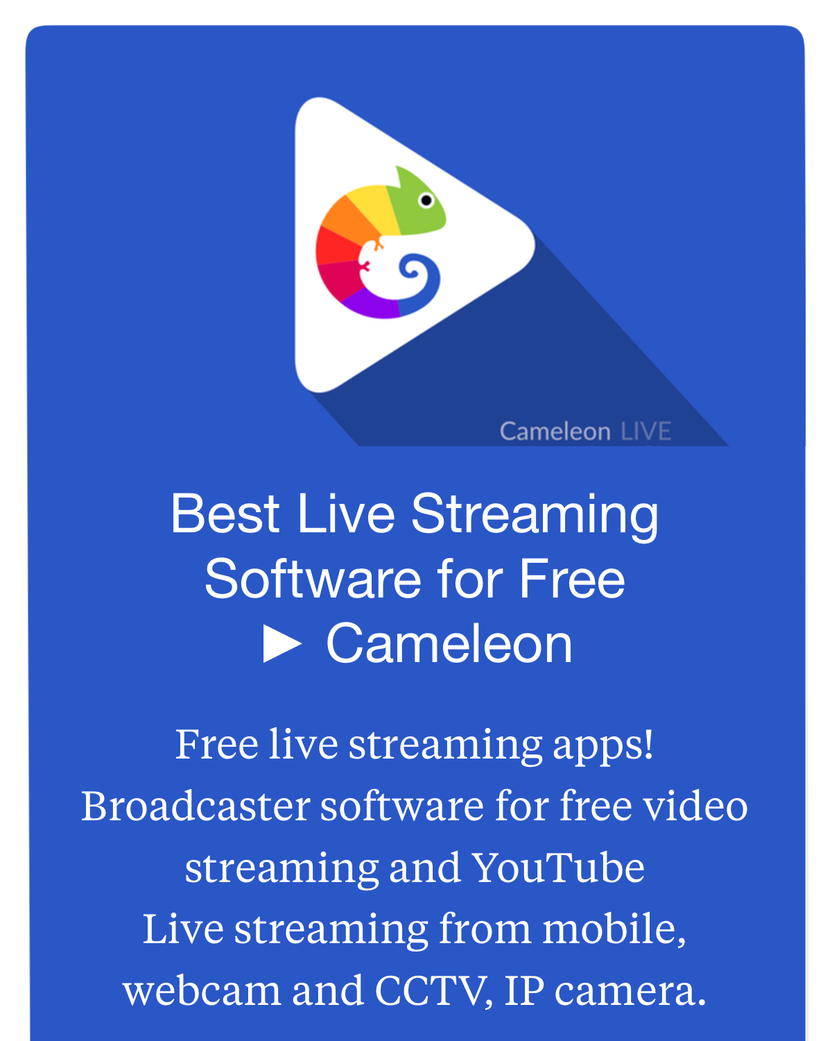 That's 90% off for upcoming Cameleon Apps. Stream live to YouTube and Facebook using your iPhone/iPad and get Cameleon 2.0 with Facebook Live and new UI before it's release.